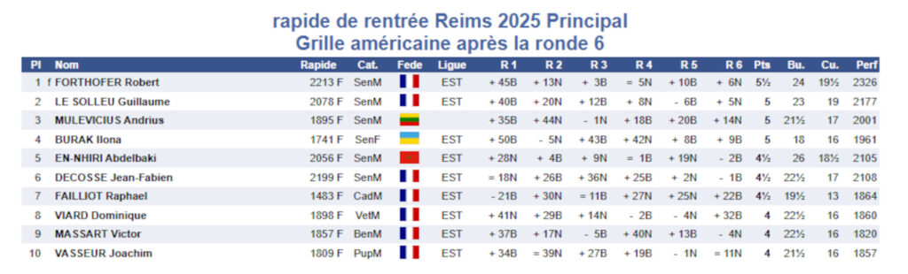 6 parties rapides en 12′ + 3″ par coup (le 20.09.2025)
