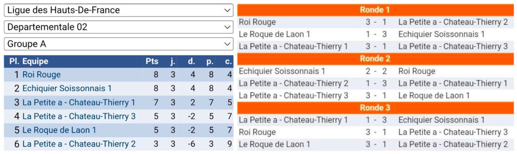 6 équipes étaient présentes, dont 3 engagées par La Petite A Echecs Château-Thierry, aux côtés des clubs de L’échiquier soissonnais , Le Roi Rouge et Le Roque de Laon Echecs.
