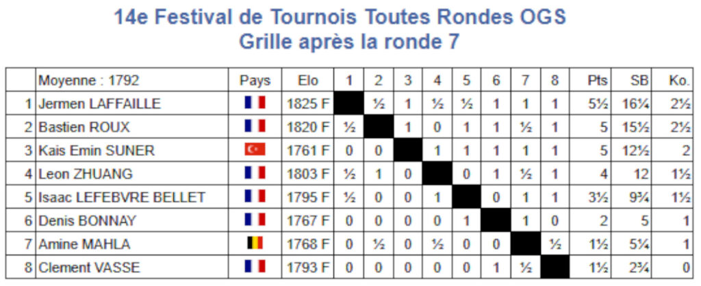 7 parties au rythme de 1h30 + 30secondes par coup sur 3 jours.